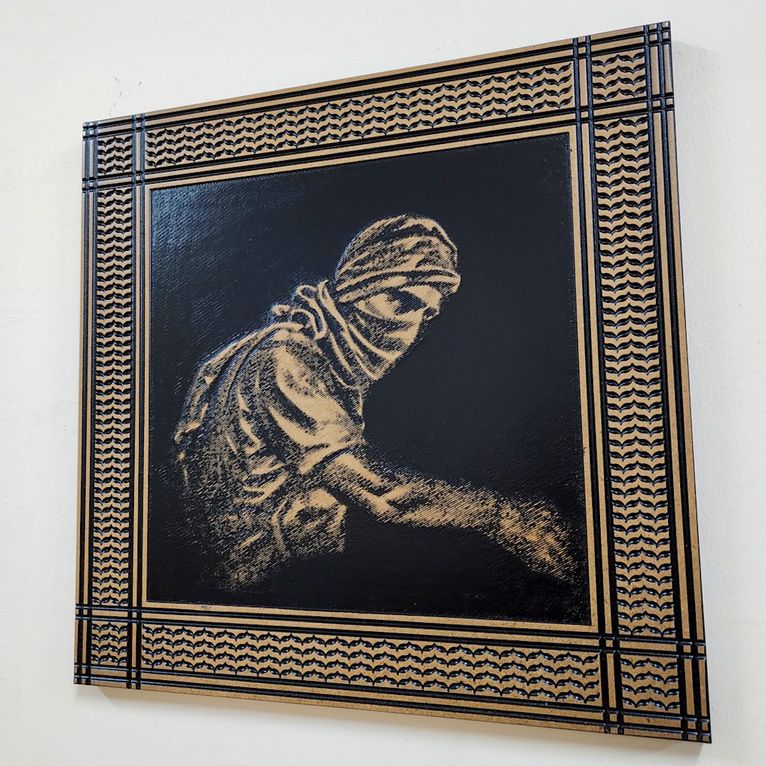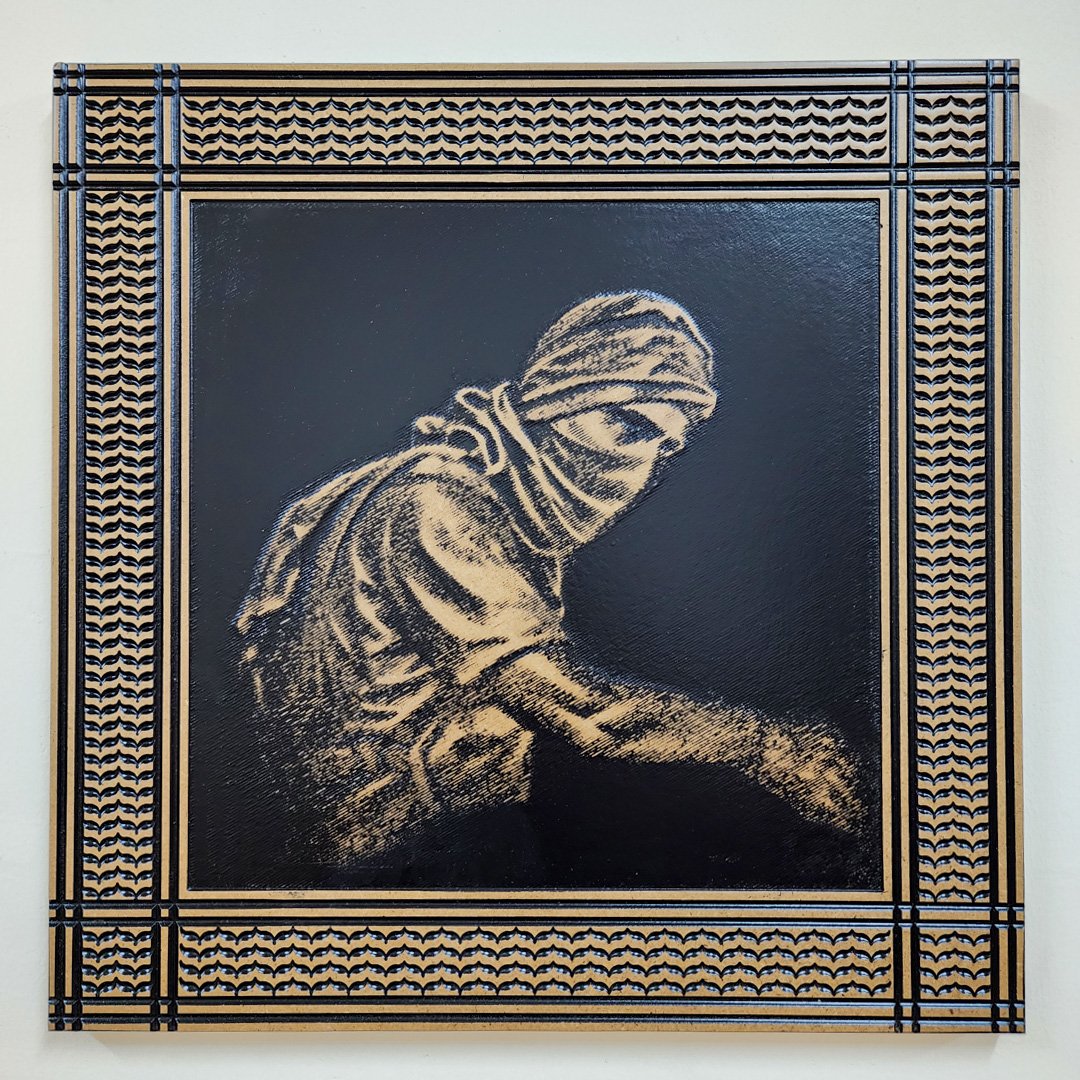 This captivating 40×40 cm wooden engraving is more than just art; it’s a piece of history. This artwork shows Yahya Sinwar, an important figure in Palestinian resistance. It is framed with the traditional kufiyah pattern, symbolizing resilience. The intricately engraved design on wood offers a raw, organic texture that brings depth and authenticity to the piece.