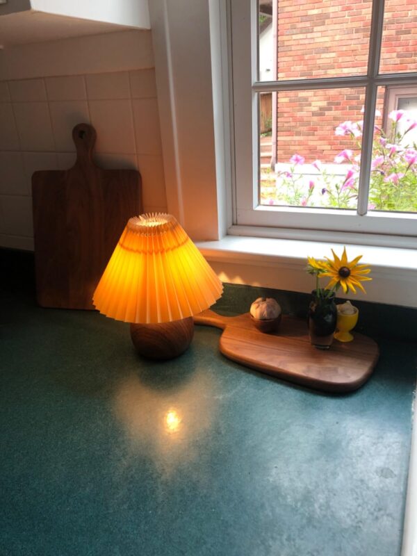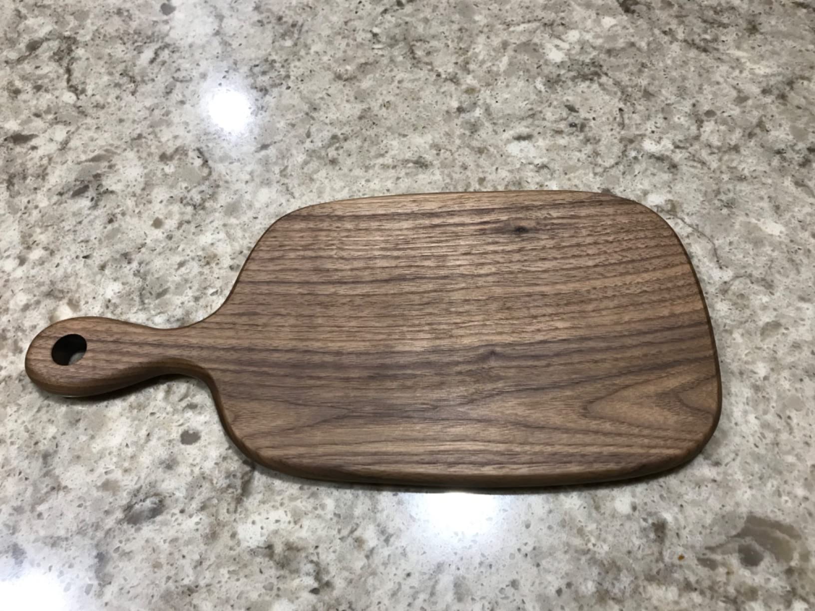Perfectly sized “sandwich” board. Beautifully grained walnut. It does look to be in a couple pieces, but the craftsmanship is quite excellent and the wood is so hard, I’m not overly concerned about glue.